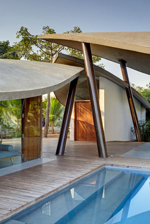 Supported by angled steel columns, the concrete roof canopies shelter all five rooms, which include four spaces surrounded by glazing and an open-air living room bordered by a lily pond and pool.