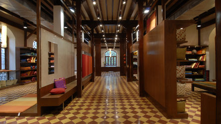 The symbols of European heritage were defined by black cobbled streets and leaded glass panes. These two elements showed the potential to straddle both worlds – the ancient European stone castles & cobbled streets, which are more subtly revived in the flooring of the store, and the bevelled & leaded lanterns & window panes of medieval Europe revived in the glass panes of the display cabinets.